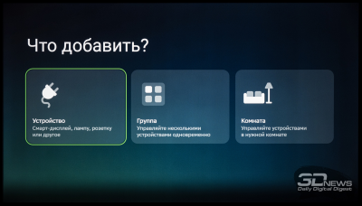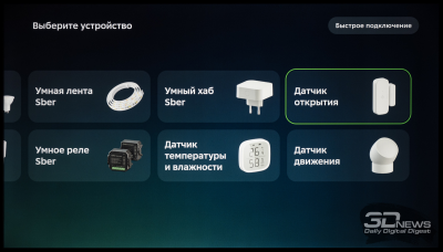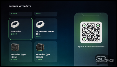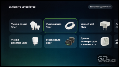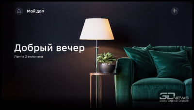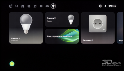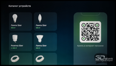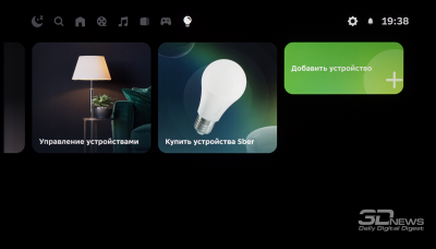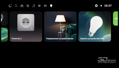 В случае использования интеллектуальных контроллеров и различных устройств «Сбера» (и ещё примерно 20 сторонних брендов) для построения «умного дома», операционная система телевизора совместно с ассистентом «Салют» позволяет создавать различные сценарии работы, а также обеспечивает прямой доступ к подключённым устройствам. Вы можете указать телевизору, какую лампочку выключить или включить, на какую температуру установить кондиционер, «поставить» кипятить чайник, экстренно отключить ту или иную розетку, получить доступ к показаниям различных датчиков — и многое другое.