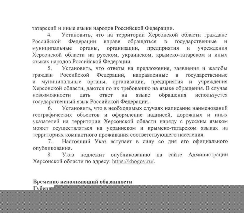 «Установить, что на территории Херсонской области наряду с русским языком в официальных сферах общения в местностях компактного проживания соответствующего населения может использоваться украинский язык, а на территории Генического и Новотроицкого районов Херсонской области — также крымско-татарский язык», — говорится в указе, обнародованном на сайте областной администрации.