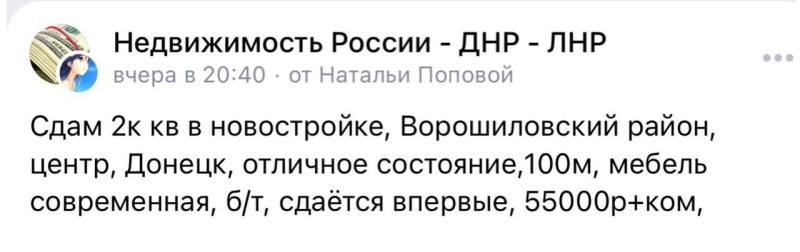 «Мониторинг цен на аренду жилья в центре Донецка. 55 тыс руб в месяц + коммунальные. Главный аргумент «сдаётся впервые». Это дорого или очень дорого?» — говорится в телеграм-канале «ЧП Донецк Z».