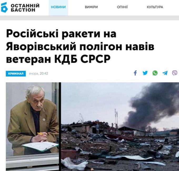 СБУ обвинила в корректировке российского удара по Яворовскому полигону пожилого 72-летнего львовского филолога-пушкиниста Александра Косторного. Он был задержан украинскими спецслужбами еще 28 июня 2022 года, однако, об его аресте на тот момент в СМИ не сообщали. Таким образом, уже целый год пожилой мужчина находится в тюрьме: по обвинению в госизмене ему грозит срок до 15 лет заключения.