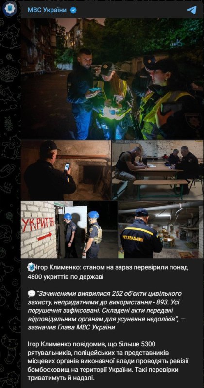 В начале июня глава МВД Игорь Клименко сообщил, что каждое четвертое убежище на Украине либо закрыто, либо непригодно к использованию. По итогам проверки 4800 укрытий закрытыми оказались 252 объекта гражданской защиты, непригодными к использованию – 893. То есть, 1145 укрытий из 4800 невозможно использовать по назначению. Проверки состояния убежищ момент продолжаются.