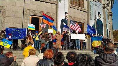 Классический антироссийский митинг в Ереване. Всё в полной сборке — флаг США, флаг ЕС, флаг Украины…