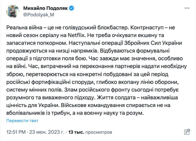 Советник главы Офис президента Михаил Подоляк переложил вину за провал украинского наступления на западных партнёров, мол слишком медленно поставляли военную технику, что якобы дало время ВС РФ укрепить позиции.