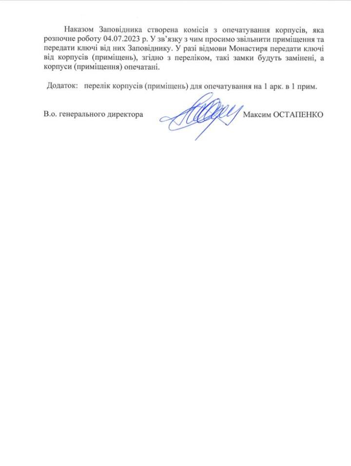 «Заповедником [«Киево-Печерская лавра»] принято решение о прекращении доступа монахов монастыря к помещениям. Приказом заповедника создана комиссия по опечатыванию корпусов, которая начнет работу 04.07.2023. В связи с этим просим освободить помещения и передать ключи от них заповеднику», — говорится в документе в адрес УПЦ, который Чекман опубликовал в своем телеграм-канале.