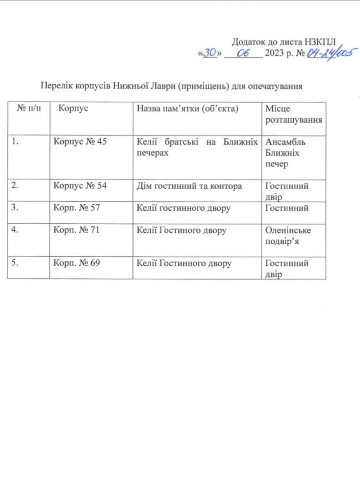 Согласно приложению к документу, монахи должны освободить пять корпусов Нижней лавры, территория которой находится в ведении УПЦ. «В случае отказа монастыря передать ключи от корпусов, согласно перечню, замки будут заменены, а корпуса опечатаны», — указано в письме.