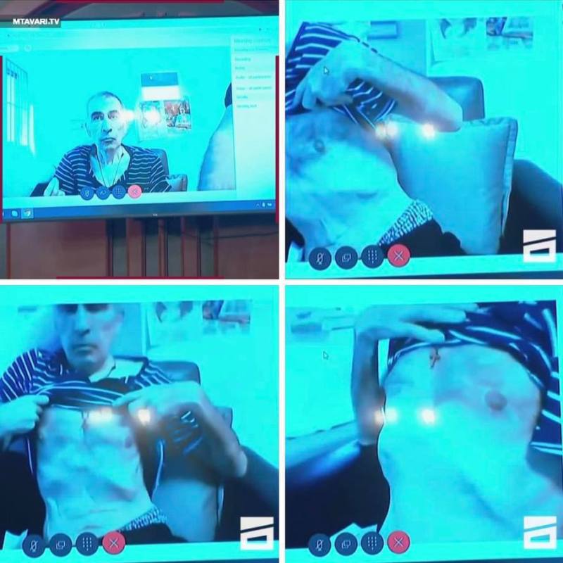 В ходе своего выступления политик задрал рубашку и продемонстрировал степень своего истощения. «Я хочу сказать всем сторонникам, что мы сейчас хотим единства, мы хотим силы, мы должны излучать силу, потому что напуганное правительство излучает слабость, и я, может быть, физически слаб, но я очень силен внутри», — заявил Саакашвили.