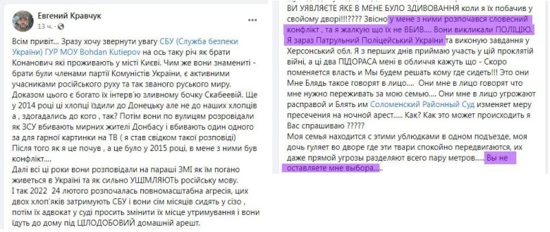 «Мы, братья Кононовичи, украинские коммунисты и антифашисты, официально заявляем, что режим Зеленского готовит наше убийство. Режим руками действующего работника полиции Евгения Кравчука публично и не однократно предупредил нас о готовящемся нашем убийстве. Полицейский написал призывы к убийству в Фейсбук и активно распространяет наш адрес проживания, зная, что мы находимся под домашним арестом и никуда не можем уйти, то есть, находимся в ловушке. Только с подачи власти действующий работник полиции может публично, никого не боясь, делать такие заявления и призывы. Этим нас официально объявляют вне закона, давая понять, что за наше убийство никому ничего не будет. Это практика 30-х годов XX века нацистской Германии, где коммунисты и антифашисты объявлялись вне закона. Режим Зеленского хочет устроить показательную казнь», – заявили братья-антифашисты.