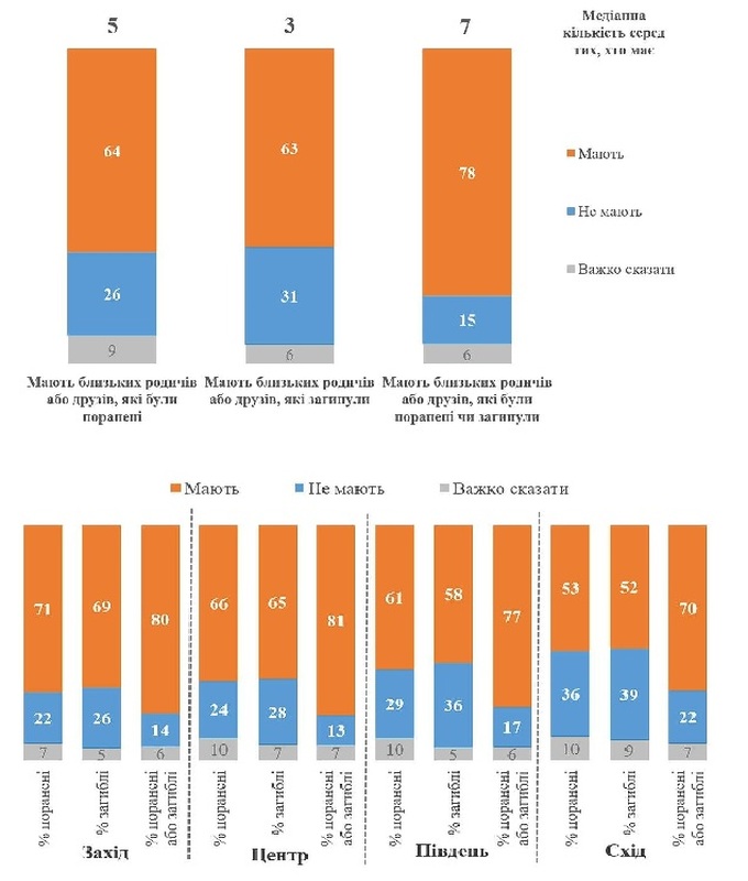 А результаты опроса Киевского международного института социологии (КМИС) говорят о том, что 78% украинцев имеют близких родственников или друзей, которые были ранены или погибли во время полномасштабной войны. В среднем респонденты имеют по семь близких родственников или друзей, которые были ранены или погибли. При этом 63% украинцев имеют погибших друзей или родных. Наиболее высокий показатель по убитым на западе Украины – 69% (центр – 65%, юг – 58%, восток – 52%).
