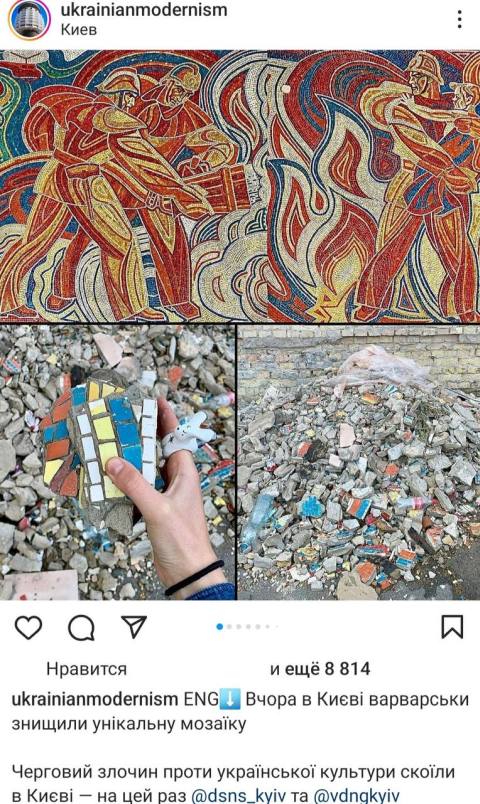 Стоит отметить, что на территории Украины под надуманным предлогом «советчина», без анализа и оценки специалистами исторической и художественной ценности повсеместно уничтожаются уникальные украинские мозаики. При этом Минкульт игнорирует многочисленные обращения о создании их охранного реестра. Взамен уничтоженных полотен ничего даже близкого по уровню предложить не могут.