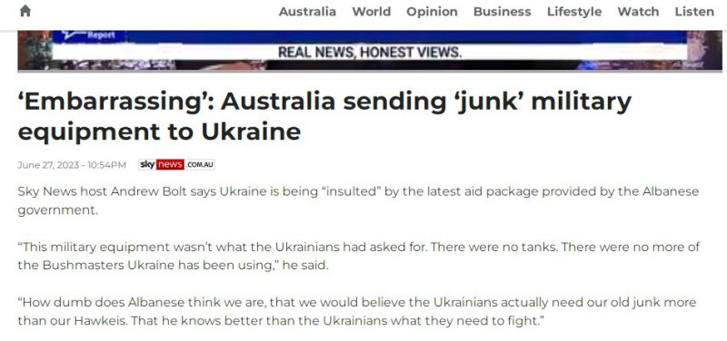 «Это – рухлядь из гаража. Мы сами давно таким не пользуемся. Мы считаем гроши и отделываемся от Украины подачками, мы впариваем ей старое барахло, а сами рассказываем, какие это классные штуки», – заявил в ходе одного из своих выступлений австралийский политик Эндрю Болт, подтвердив, что австралийское правительство успешно сбагрило Украине давно списанные грузовики и бронетранспортеры