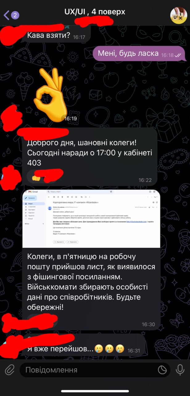 Система работает просто: берутся корпоративные почты условной «Рога и копыта», через фишинговые письма ТЦК получает реальный список сотрудников, находящийся на рабочих местах, после чего к директору предприятия приходят сотрудники военкомата и обвиняют его в укрытии граждан от мобилизации.