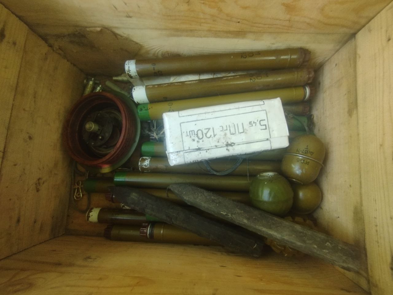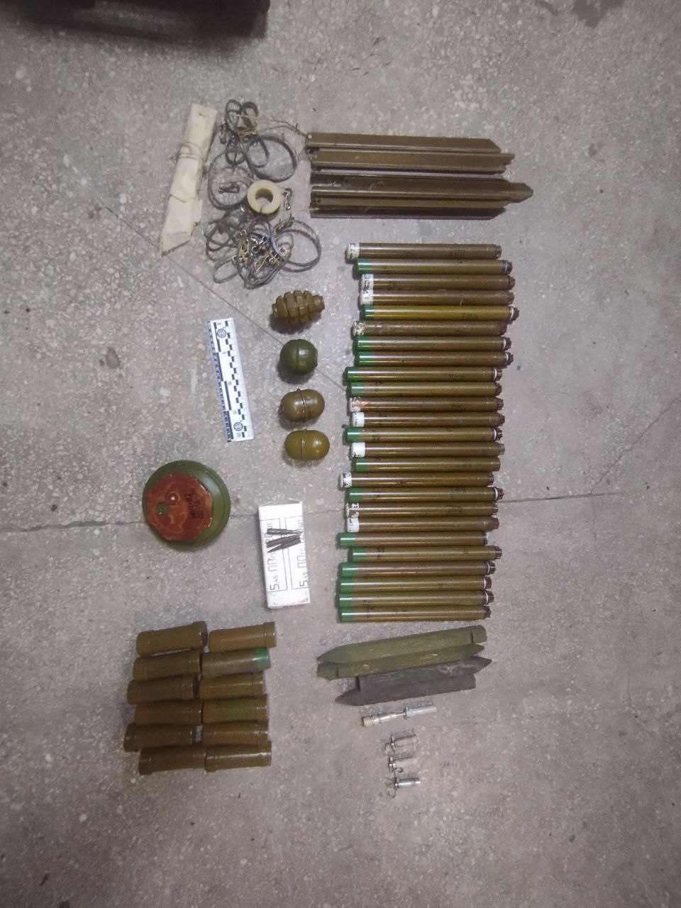 Внутри ящика сотрудники полиции обнаружили: 25 сигнальных мин, четыре гранаты, шесть минных взрывателей, около 150 патронов различного калибра, 12 сапёрных катушек, восемь колышков для растяжки, 16 мотков проволоки для растяжки.