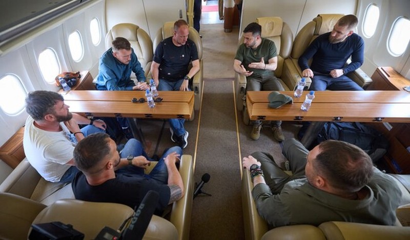 Владимир Зеленский разместил в своём телеграм-канале кадры с возвращением участников оккупации Мариуполя. Помимо членов «Азова» (запрещён в России и признан террористическим) Дениса Прокопенко, Святослава Паламара и Олега Хоменко, на Украину вернулись командир 12-й бригады Нацгвардии Денис Шлега и командир 36-й бригады морской пехоты ВСУ Сергей Волынский по кличке Волына.