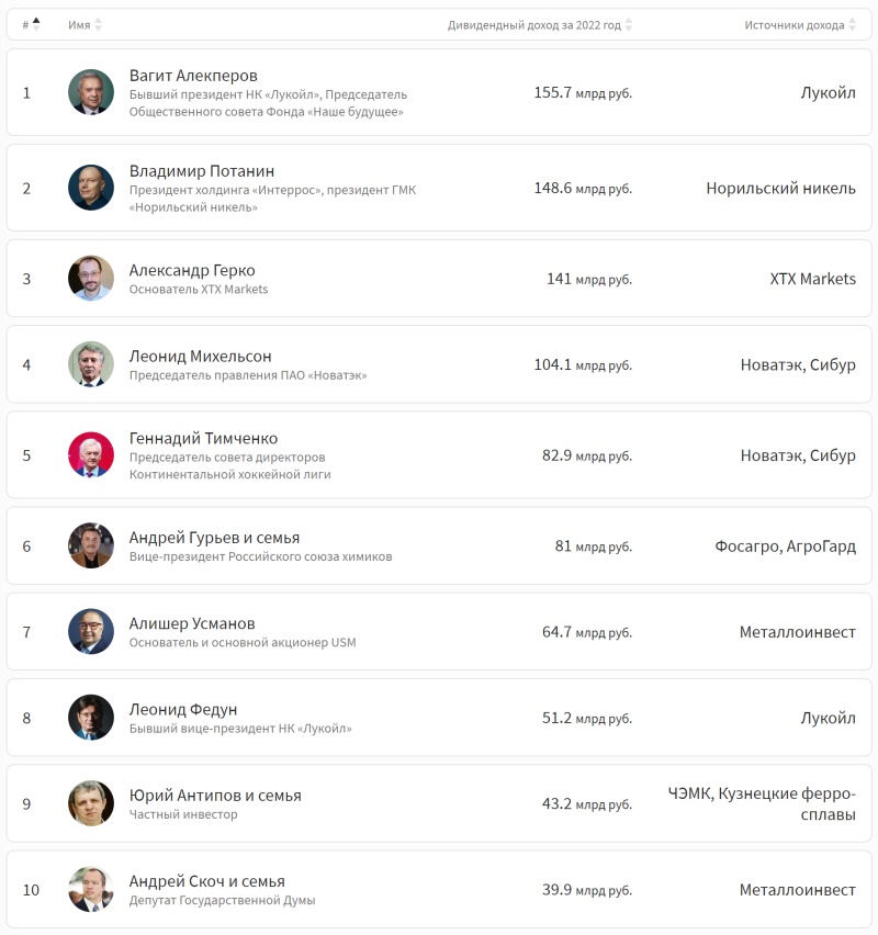 В публикации говорится, что в декабре 2022 года «Лукойл» объявил о выплате дивидендов сразу за 2021 год и 9 месяцев 2022 года общей суммой в 549 млрд рублей. Вторым в рейтинге стал президент и совладелец «Норильского никеля» Владимир Потанин, чей дивидендный доход от активов «Норникеля», по оценкам издания, составил 149 млрд рублей. На третьей позиции оказался основатель XTX Markets Александр Герко. Дивидендный доход основателя трейдинговой компании оценивается в 141 млрд рублей.