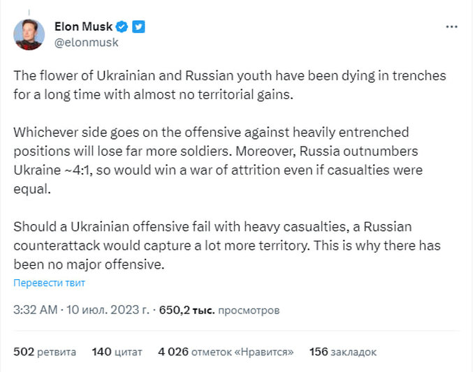 «Цвет украинской и российской молодежи гибнет в окопах почти без территориальных завоеваний». Илон Маск прокомментировал конфликт на Украине