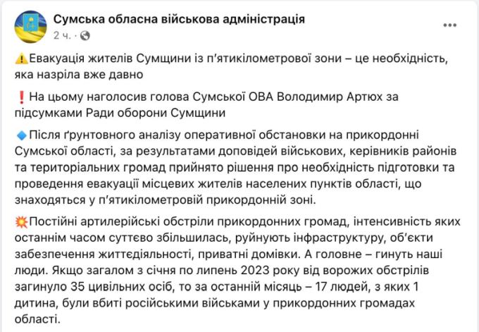 «Советом обороны Сумской области было принято решение о необходимости подготовки и проведения эвакуации. Проводится системная подготовительная работа», — заявили в администрации.