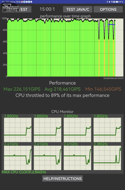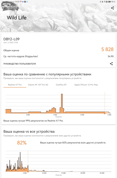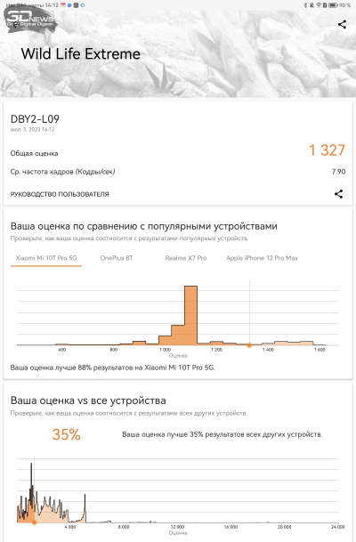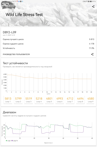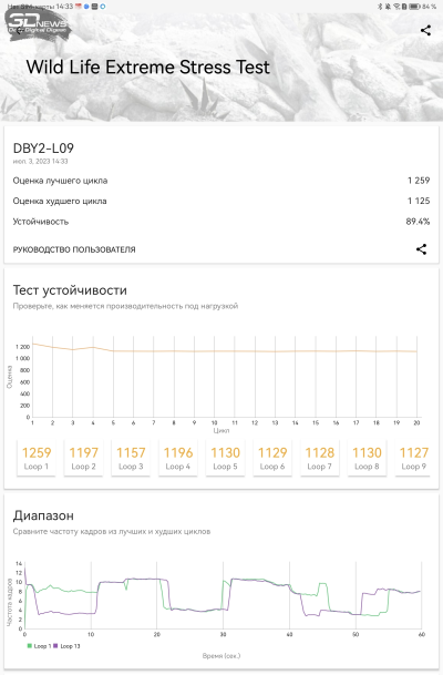 Основная проблема Qualcomm Snapdragon 888 – не в том, что это флагманская платформа трехлетней давности. Производительности ей еще вполне хватает, в том числе и для планшета, рассчитанного на серьезные рабочие задачи. Нет, проблема в том, что 888-я — одна из самых примечательных за последние годы «печек», доводивших устройства в том числе и до реального перегрева. И по поводу охлаждения очень тонкого планшета были основания волноваться. По счастью, наши опасения не подтвердились. Тактовая частота в одном из ресурсных тестов упала почти на 30%, в остальных она близка к пиковой. Планшет под нагрузкой теплеет, но не становится раскаленным. В общем, с отводом тепла от горячей платформы в HUAWEI справились хорошо.