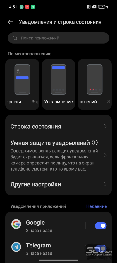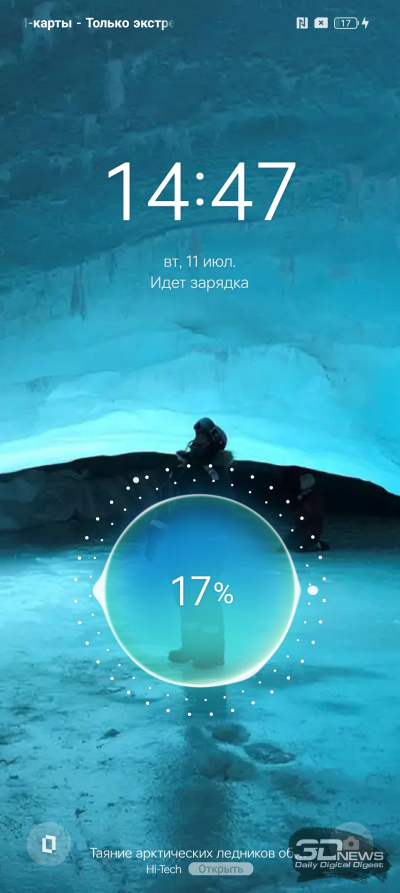 Cканер отпечатков пальцев расположен под экраном, для него используется оптический сенсор, который не реагирует на прикосновения влажного или жирного пальца. Да и в целом мне не очень понравилось, как он здесь работал, – процент брака был больше обычного. Также он расположен слишком близко к нижней кромке, в неестественном месте, куда сложно дотянуться большим пальцем — смартфон приходится перехватывать в руках. Из плюсов отмечу тактильный отклик не только при неудачном срабатывании сканера, но также и при подтверждении успешного срабатывания. Продублировать сканер можно при помощи системы распознавания лица, которая работает на основе обычной фронтальной камеры.