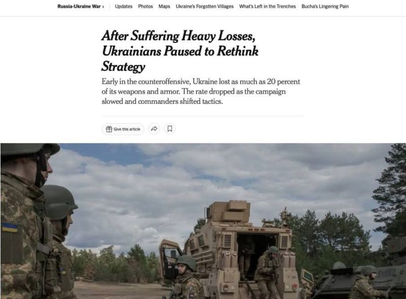 Итак, Украина потеряла значительную часть запасов западного вооружения для наступления, с чем, собственно, и связано отсутствие оного. Только в первые две недели активизации боевых действий со стороны Украины ВСУшниками было безвозвратно потеряно более 20% от общего западного вооружения без учёта повреждённой техники, которая требует длительных восстановительных и ремонтных работ, причём, не на территории «незалежной». Об этом пишет The New York Times со ссылкой на американских и европейских чиновников. Таким образом, «ушло в туман» немало европейского «железа», в основном — танков и бронетранспортёров, без которых, по заявлениям украинских чиновников, «контрнаступление невозможно было представить».
