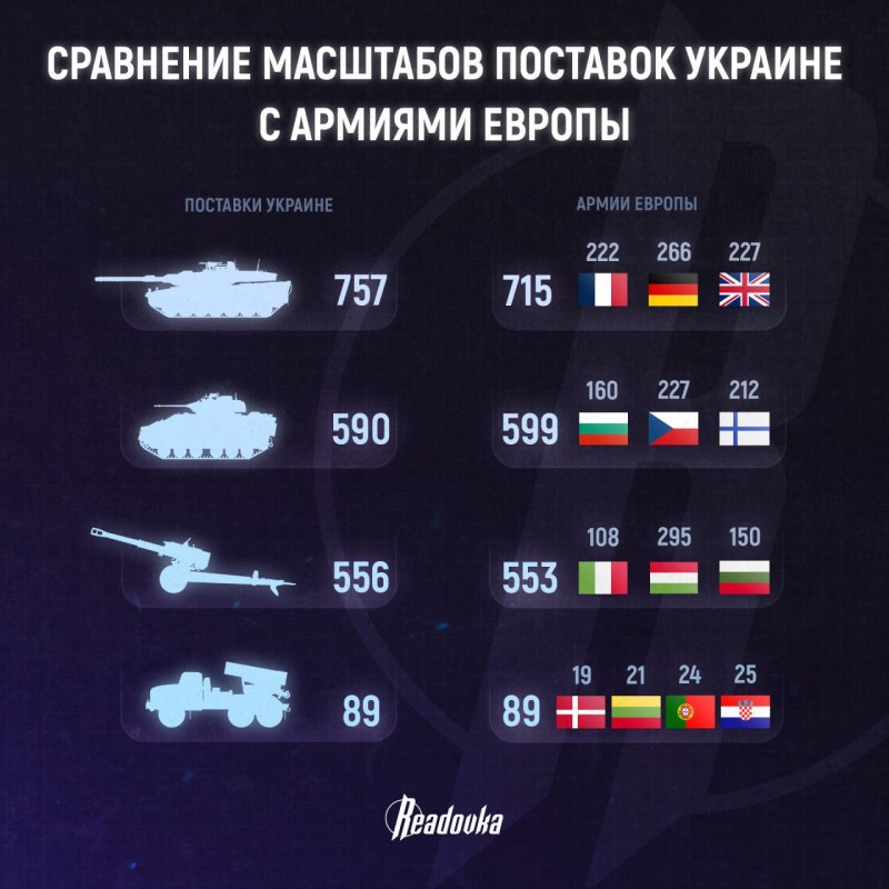 «За первые 16 месяцев СВО Запад взял на себя обязательства по передаче такого количества техники, которого хватило бы на вооружение нескольких европейских армий. БМП будет переслано столько же, сколько совокупно имеется на активной службе в вооруженных силах Чехии, Болгарии и Финляндии. В Дании, Литве, Португалии и Хорватии в каждой порядка двух десятков РСЗО: в сумме ровно столько, сколько ранее пообещали Украине – 89», – отмечает издание Readovka.