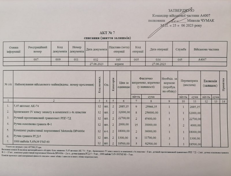 На фоне всего этого в «незалежной» активно расхищается помощь и военное имущество, продаются «налево» оружие и боеприпасы. Приведем всего лишь несколько примеров за июль. Так, на списании оружия и боеприпасов, пригодных к дальнейшему использованию, с целью их последующей продаже на черном рынке «засекли» командира 110-й омбр ВСУ полковника Николая Чумака. В Сеть слили, в том числе, и акты списания, формируемые после проведения так называемых «внутрибригадных расследований».