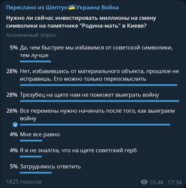 В частности, результаты соцопроса «Шептуна» показали, что подавляющее большинство (28%) считает, что «трезубец на щите не поможет нам выиграть войну», а также, что «избавившись от материального объекта, прошлое не исправишь».