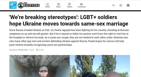 Далее издание пишет: «Первые открытые солдаты-гомосексуалисты надеются, что Украина станет другой и признает военный вклад своих ЛГБТ-солдат. Нынешние законы означают, что их партнёры “сидят дома одни, просто ждут, зная, что их пара находится в батальоне на Донбассе. Это ужасно. Это так ужасно”».