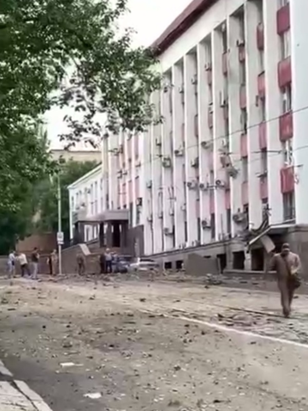 К счастью, ракета попала не в само здание, а рядом, поэтому удалось избежать больших жертв. В результате удара фасад здания весь искорежен, окна выбиты. Сильно пострадала прилегающая территория, прямо рядом с домом огромная воронка.