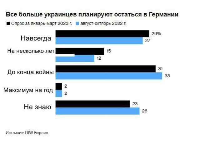 В тоже время, согласно последнему опросу, около 44% украинских беженцев в Германии намерены остаться в стране на несколько лет или даже навсегда. 29% украинцев не планируют возвращаться никогда, а 15% планируют задержаться в ФРГ на несколько лет.