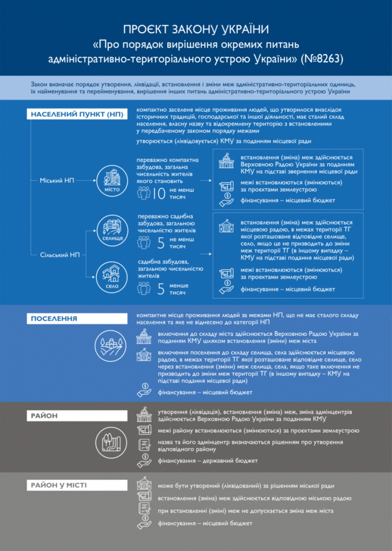 28 июля Верховная Рада приняла в целом законопроект №8263 «О десоветизации порядка решения отдельных вопросов административно-территориального устройства Украины», который отменяет действующее с 1981 года «советское регулирование вопросов административно-территориального устройства».