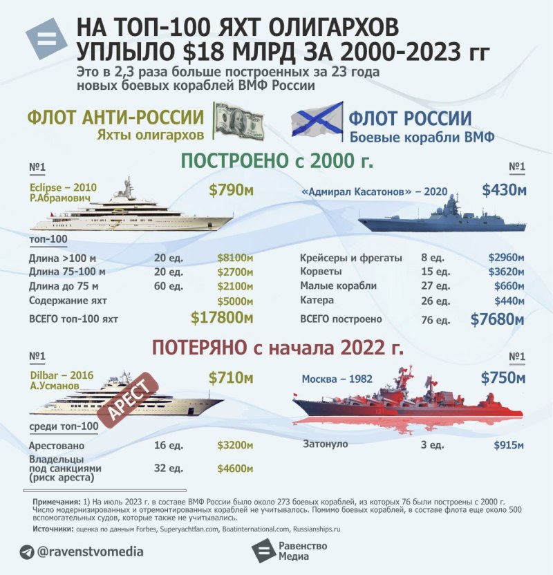 Сотрудники телеграм-канала «Равенство. Медиа» подсчитали, что на топ-100 яхт олигархов за 23 года потрачено 18 миллиардов долларов, что в 2,3 раза больше затрат государства на новые боевые корабли ВМФ РФ.