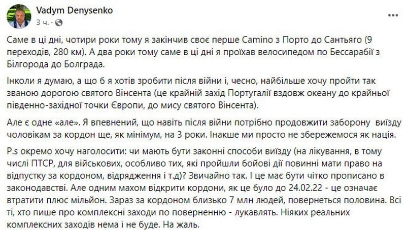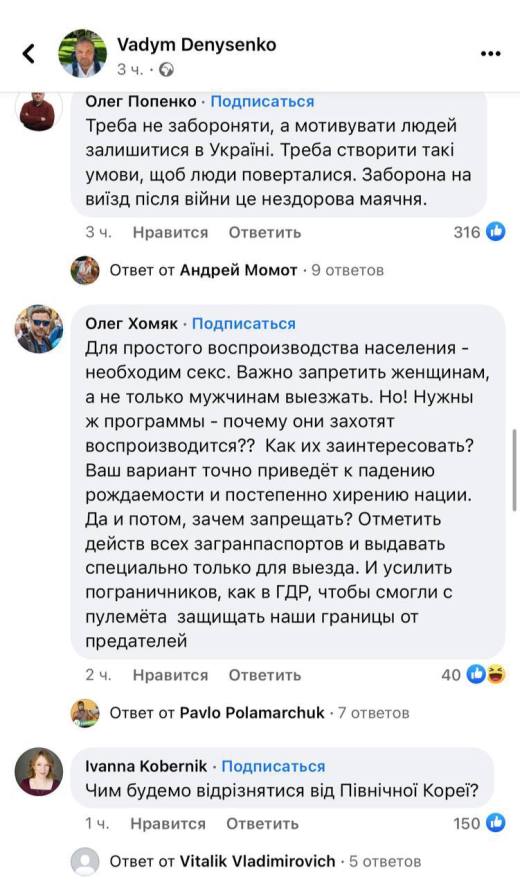 Экс-нардеп, а ныне директор Украинского института будущего Вадим Денисенко предлагает запретить украинским мужчинам выезд за границу минимум на три года после завершения военного конфликта.