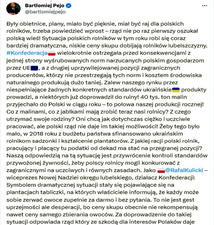 Подчеркнем, что накануне политик Бартоломей Пейо, возглавляющий отделение партии «Конфедерация» в Люблине, заявил, что положение польских фермеров ухудшается, поскольку украинские производители имеют некие привилегии, и их дешевая некачественная продукция наводнила рынок. Политик подчеркнул, что в ряде случаев закупочная цена не может покрыть даже себестоимость продукта, что привело к разорению большого количества фермеров.