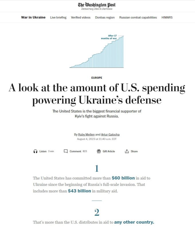 Вашингтон направил Украине $66,2 млрд. военной, финансовой и гуманитарной помощи, которая, таким образом, стала крупнейшим получателем помощи от США со времён Второй мировой войны. И хоть в контексте всего военного бюджета США, составляющего $1,66 трлн. этот объём кажется незначительным, однако, к примеру, Израиль получил всего лишь $8,6 млрд. в 2022-2023 годах, а Тайваню в конце июля пообещали только $300 млн. Об этом сообщает американская газета The Washington Post.