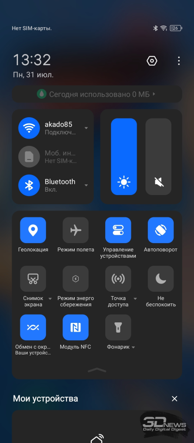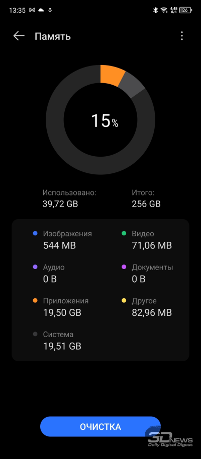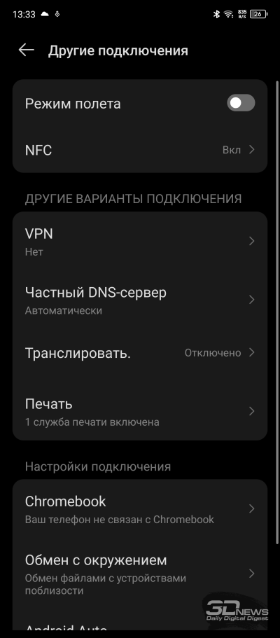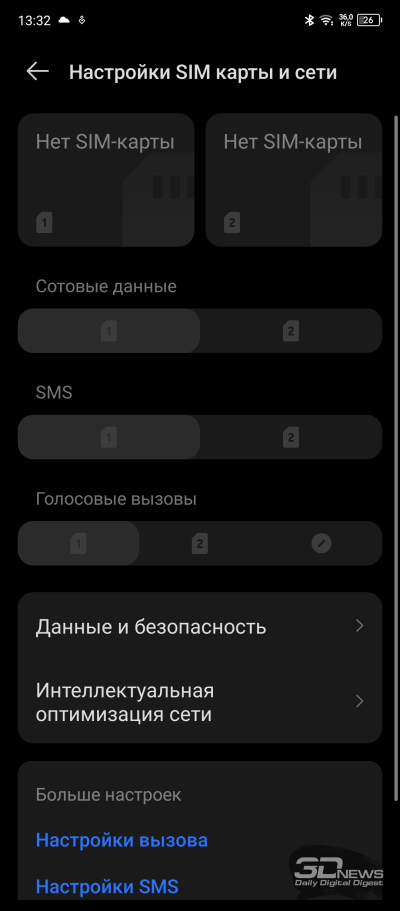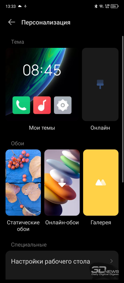 Настроек дисплея немного: яркость (в том числе адаптивная яркость); режим «Защита зрения» с теплыми цветами, который уместно включать перед сном; темная тема с возможностью настроить расписание ее работы; размер шрифтов; режим «В кармане», при котором снижается чувствительность сенсорного слоя дисплея во избежание случайных действий с ним.