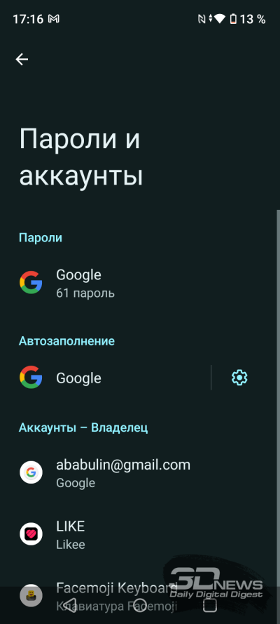 Сканер отпечатков, как я уже писал выше, вмонтирован в клавишу питания, которая слегка утоплена в корпус и тем отличается от выступающей клавиши регулировки громкости, благодаря чему ее легко найти на ощупь. Емкостный сенсор в меру чувствительный (срабатывает стабильно, но при этом случайные разблокировки в кармане исключены), есть тактильное подтверждение срабатывания. Но, само собой, из-за небольшой площади сенсора неизбежно снижается процент успешных срабатываний. Наряду с дактилоскопическим сенсором также имеется система идентификации лица при помощи фронтальной камеры.