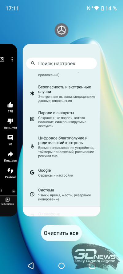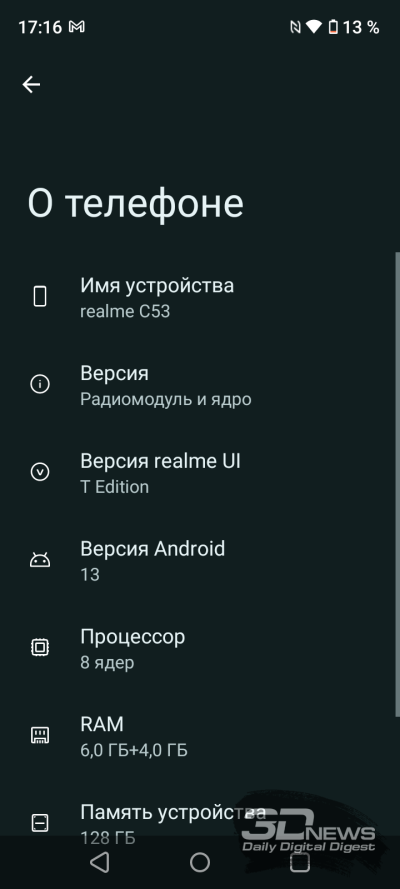 Работает realme C53 под управлением Android 13 с оболочкой realme UI T Edition – специальной «облегченной» версией фирменной оболочки бренда для недорогих и не слишком мощных смартфонов. Визуально и по пользовательскому опыту отличий от актуальной realme UI (например, примененной на недавнем realme 11 Pro+) не так много: иначе организовано подменю настроек, некоторые приложения пропали (хотя предустановлено все равно очень много), визуальных эффектов поменьше. Зато имеется дебютировавшая на realme C55 зона вокруг фронтальной камеры, названная «мини-капсулой», куда выводится информация о заряде аккумулятора, а также данные об использовании установленного лимита на загрузку данных в сутки и количестве пройденных шагов. Работает оболочка для смартфона на не самой серьезной аппаратной платформе быстро, а главное — стабильно.