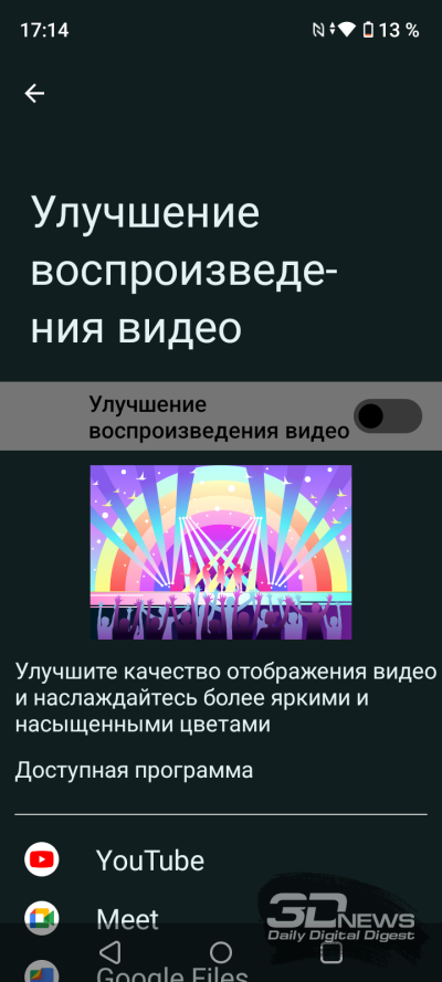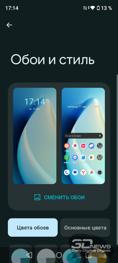 В настройках дисплея можно изменить не только частоту обновления, но и размер, а также тип шрифтов, отрегулировать систему отображения часов и значков уведомлений на заблокированном смартфоне, установить темную или светлую тему интерфейса (или настроить таймер их включения). Имеется опция программного расширения цветовой гаммы в видео, которая, впрочем, не оказывает особенного влияния на картинку. Цветопередача дисплея регулируется: есть две основные предустановки («Яркие цвета» и «Нежность») с возможностью выбора цветовой температуры в ярком режиме. Я измерил цветопередачу экрана realme C53 в обоих режимах со стандартной цветовой температурой.