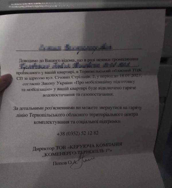 Тем временем, украинцам начали приходить «письма счастья». К примеру, собственники жилья в Тернополе получили послание следующего содержания: «В вашей квартире прописан призывник. Если он не явится в военкомат – отключим горячую воду и газ».