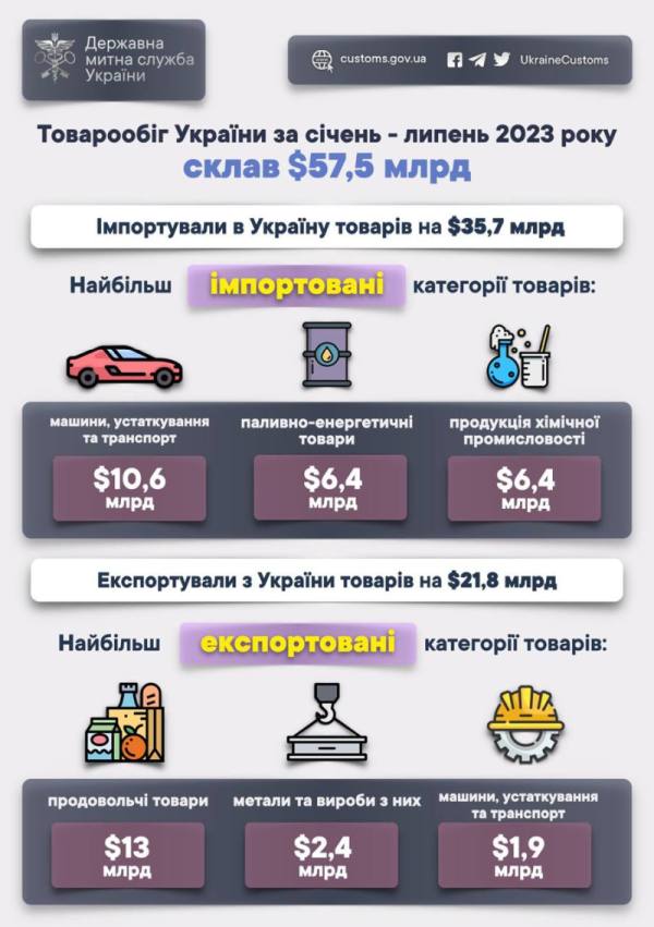 За семь месяцев на Украину импортировали товаров на сумму 35,7 млрд долларов, а экспортировали — на 21,8 млрд долларов.