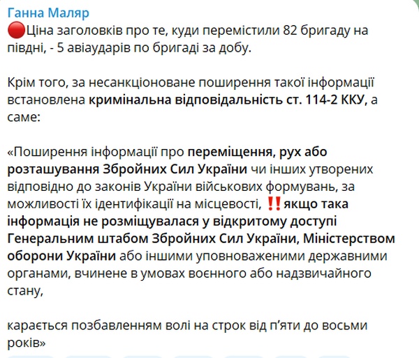 Собеседник украинского интернет-издания привёл в пример вчерашнее заявление замминистра обороны Украины Анны Маляр, в котором она обвинила в потерях боевиков резервной 82 десантно-штурмовой бригады на Запорожском направлении издание Forbes. Мол из-за опубликованной статьи о передвижении резервной бригады, по ним нанесли пять авиаударов.