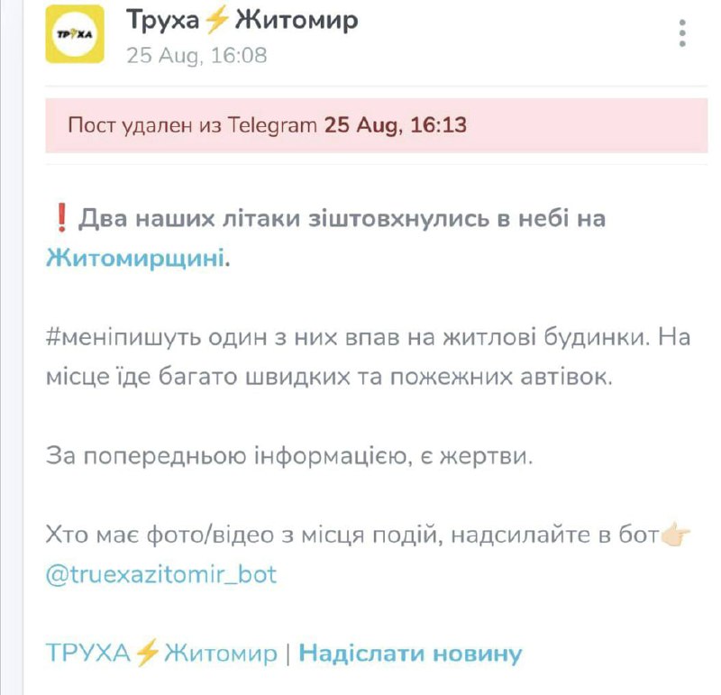 Вчера в небе над Житомирской областью столкнулись два украинских истребителя МиГ-29, об этом сообщали местные СМИ, практически сразу удалившие новость об инциденте. Как минимум, среди экипажей «винищувачей» есть погибшие, это подтверждают в соцсетях.