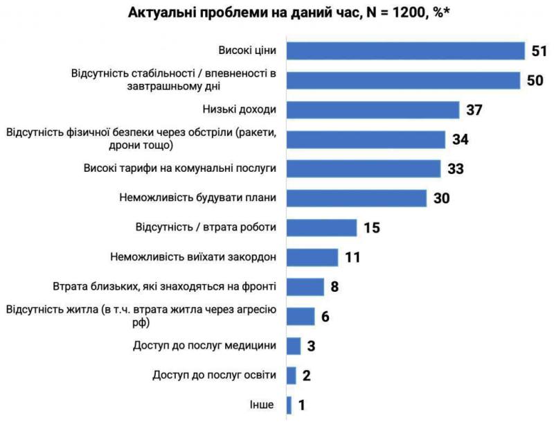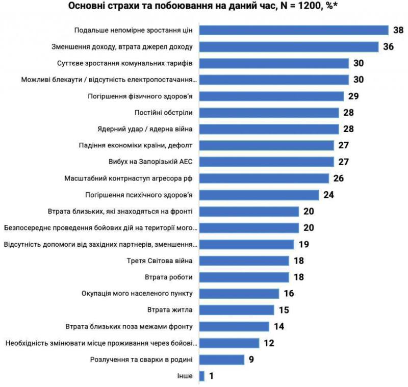 Как оказалось, больше всего украинцев пугают не обстрелы, а рост цен и коммунальных тарифов, уменьшение дохода и потеря источника заработка. Об этом свидетельствуют результаты опроса, проведённого компанией «Нью Имидж Маркетинг Груп» по заказу Украинского института будущего. Так, 38% украинцев назвали дальнейший непомерный рост цен одним из главных своих страхов в обозримом будущем. 36% опрошенных боятся уменьшения дохода или потерю источников заработка, а значительный рост коммунальных тарифов пугает 30% респондентов. Среди актуальных насущных проблем 51% украинцев назвали высокие цены, а 50% граждан не уверены, что «завтрашний день» принесёт стабильность в их жизни.