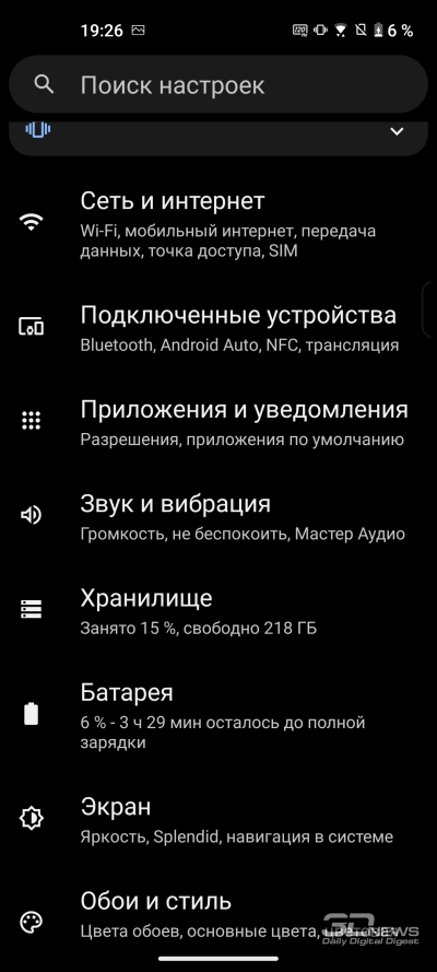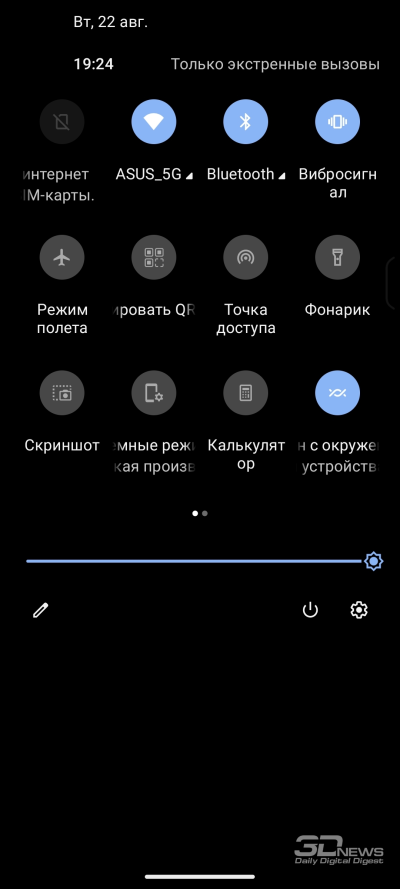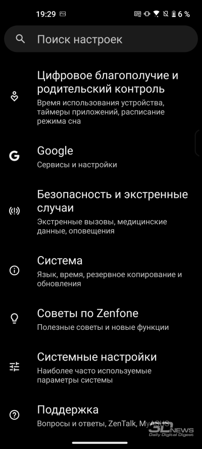 Традиционно для ZenUI доступно множество экранных настроек. Тут и адаптивная яркость, и сразу два режима защиты глаз (наряду с ночным режимом с его теплыми оттенками, от которых меньше устают глаза, есть также отдельный режим, понижающий яркость одновременно с технологией DC Dimming – он удобен при чтении электронных книг), и регулировка частоты, и изменение цветовой схемы (темная/светлая). А также масштабирование приложений — и так далее.
