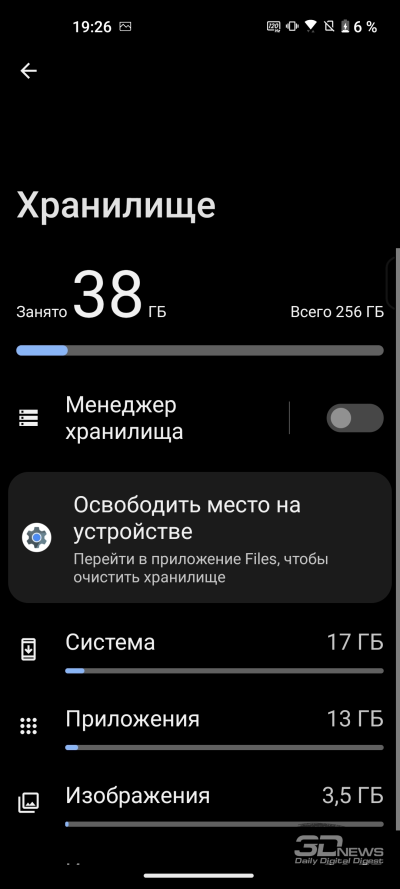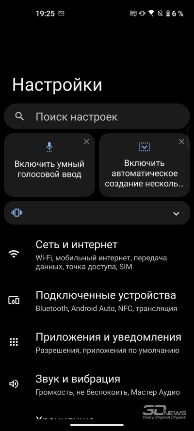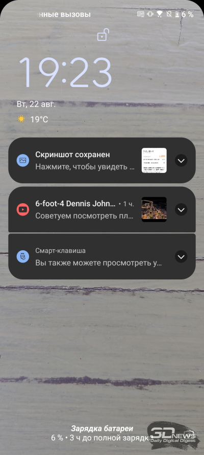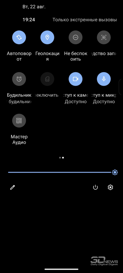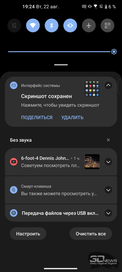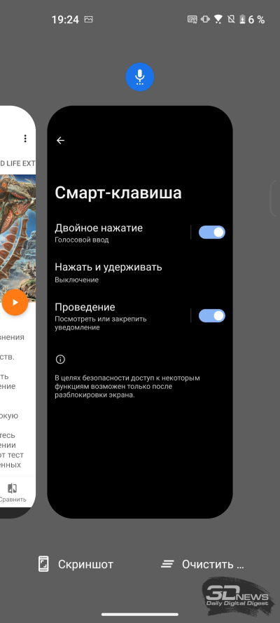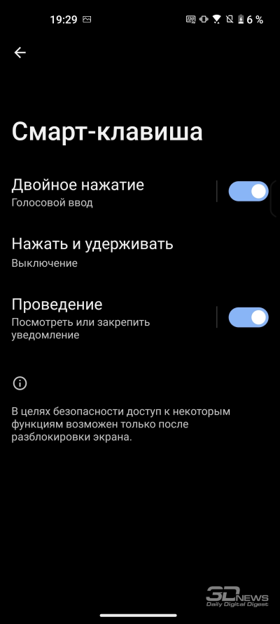 Функциональные элементы, помимо уже упомянутого много раз мини-джека, следующие: клавиша питания, в которую встроен сканер отпечатков (да-да, здесь он не экранный), клавиша регулировки громкости, порт USB Type-C, динамик, микрофоны, слот для операторских карточек. Вроде все как обычно, но есть пара нюансов. Первый: клавиша питания умеет реагировать не только на обычные нажатия, но и на двойные, а также на жест смахивания. С помощью смахивания выводится меню уведомлений (фактически дублируется экранный жест), а двойным нажатием вызывается голосовой помощник.