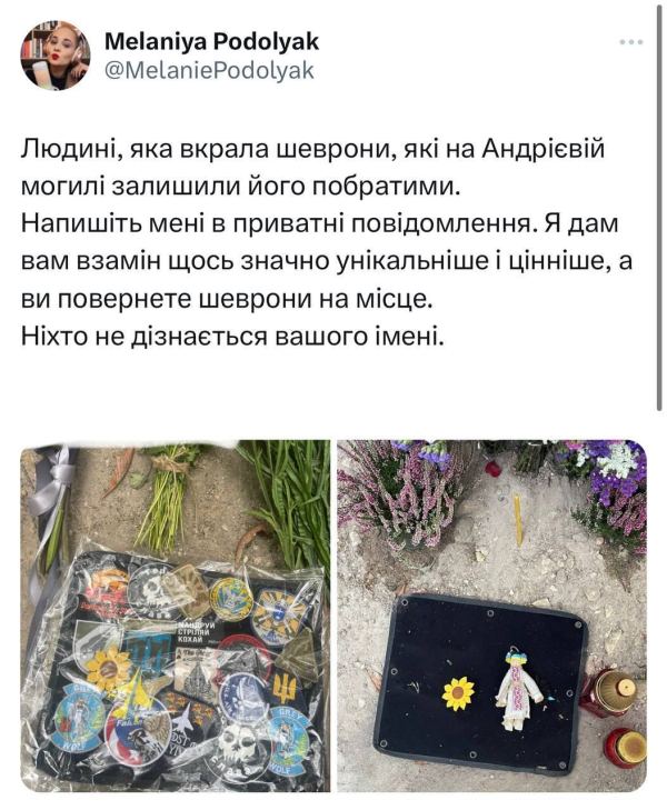 «Человеку, укравшему шевроны, которые на могиле Андрея оставили его побратимы. Напишите мне в личные сообщения», — написала Подоляк.