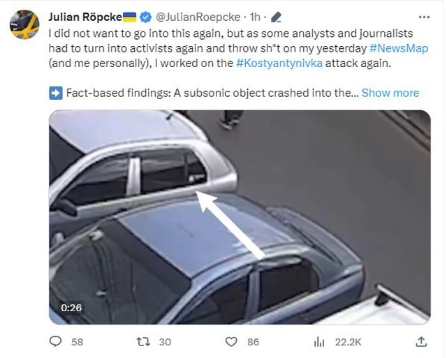 «Судя по тому, куда люди смотрят (откуда слышат звук) перед ударом и вероятным отражением летящего снаряда в автомобиле, ракета, попавшая в Константиновку, прилетела с северо-запада. Надеюсь, это можно констатировать, не называя имён», — написал журналист у себя в соцсетях.