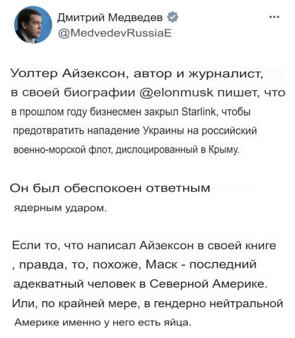 Зампредседателя Совбеза РФ Дмитрий Медведев, комментируя информацию о том, что Илон Маск ограничивал работу Starlink вблизи Крыма, сорвав таким образом атаку Киева на полуостров, заявил, что, если это правда, то Маск — последний адекватный человек в Северной Америке.