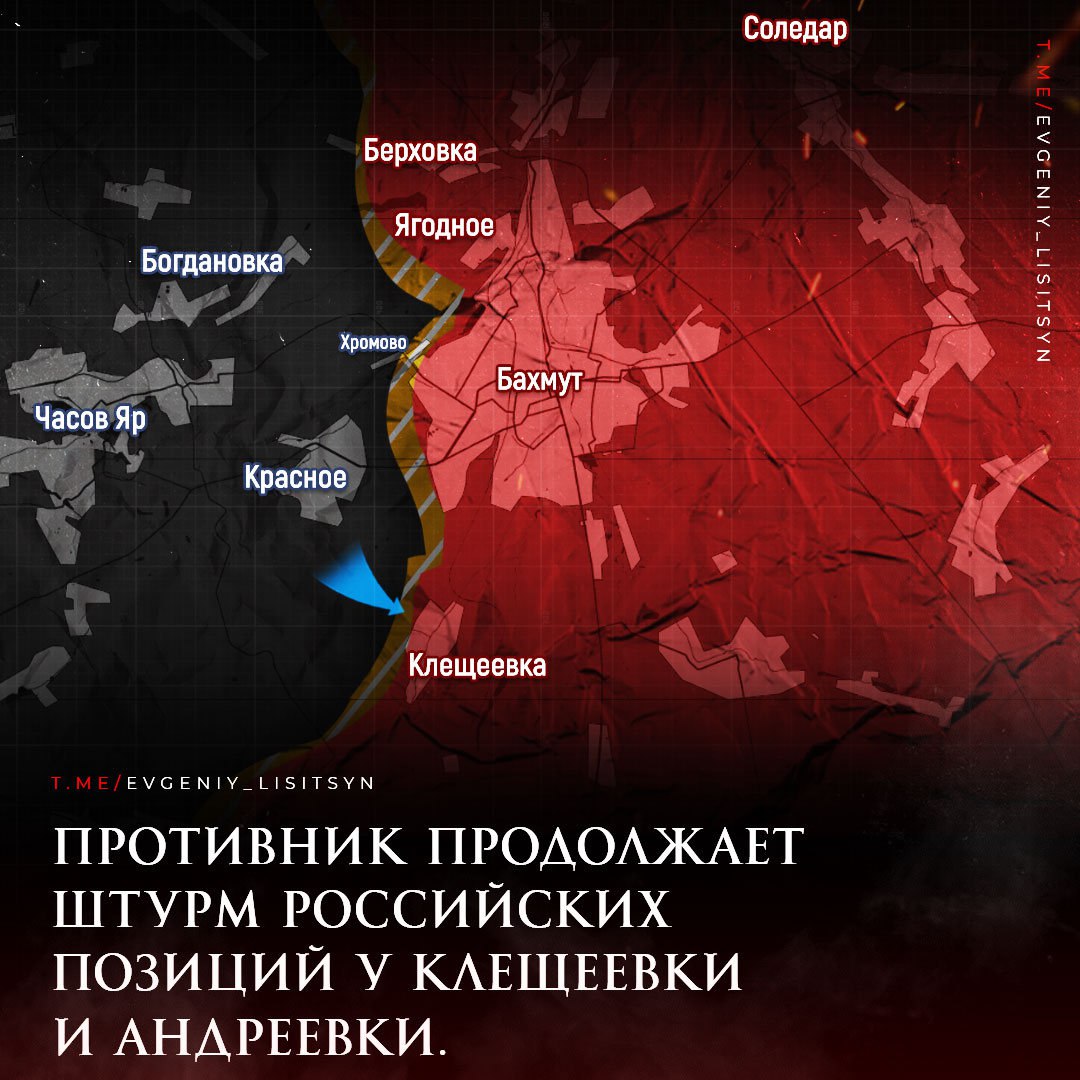 На АРТЁМОВСКОМ НАПРАВЛЕНИИ на южном фланге идут интенсивные бои, позиции переходят из рук в руки. Идут ожесточённые бои у КЛЕЩЕЕВКИ, наши контратакуют у АНДРЕЕВКИ. Также российские войска закрепляются у БЕРЕЗОВСКОГО ВОДОХРАНИЛИЩА и атакуют в районе ДУБОВО-ВАСИЛЬЕВКИ.