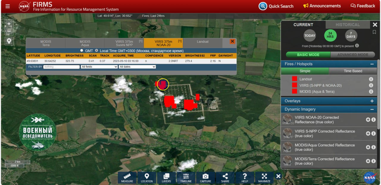 Накануне ночью дроны-камикадзе «Герань» уничтожили воинский арсенал в Ракитнянском районе Киевской области, спутники НАСА зафиксировали более десяти источников возгорания на территории складов боеприпасов после трёх часов ночи.